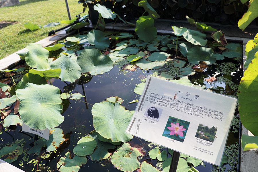 ハス見本園には、東大が2011年に品種登録した「緑地美人」、2016年登録の「月のほほえみ」など、200品種以上の花ハスが栽培されている。毎年6月~7月にかけて見本園を一般公開し、約100種が見られる。今年は6月12日から7月20日までの火曜日と金曜日の午前中、時間を限定して無料公開していた。