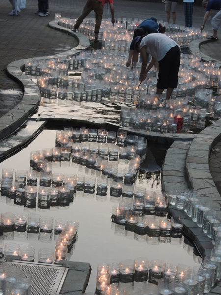 午後6時頃から、持ち寄った灯籠の中の水に浮かべたロウソクに次々明かりがともされた。伝統的な地口行灯をはじめ、挿し絵にはアニメキャラクターのイラストや似顔絵、切り絵も。ペットボトルを使った手作り灯籠も数多く並んだ。
