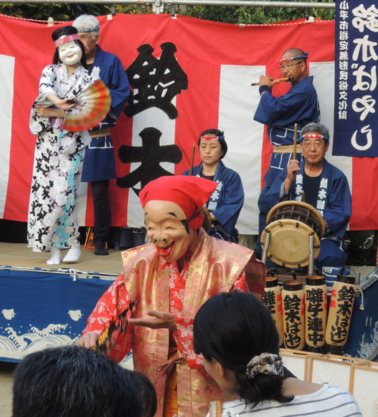 緑道沿いにある小平ふるさと村では、市指定無形民俗文化財「鈴木ばやし」の定期演奏会が開かれ、獅子舞のほか、おかめや道化の面をつけた踊り手が祭ばやしに合わせて舞いを披露した。