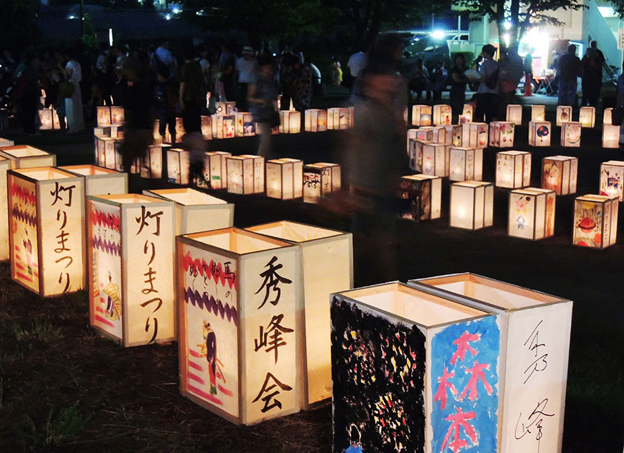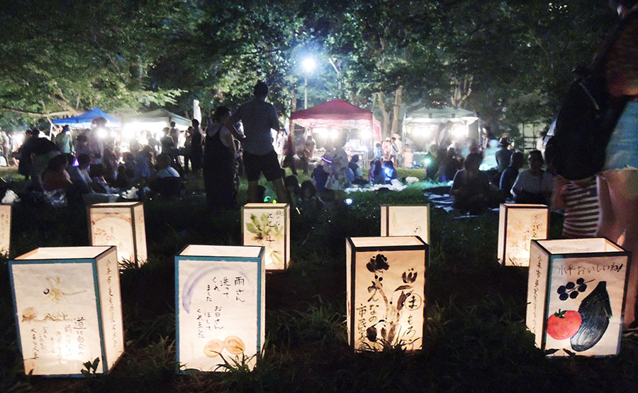 小平市に古くから伝わる「祭り灯籠」の伝統を受け継ぐ第13回「小平グリーンロード灯りまつり」が8月4日に催された。夕刻から狭山・境緑道沿いの公園や広場に地口や挿し絵を描いた灯籠約4000基が灯り、盛夏の夜を美しく彩った。