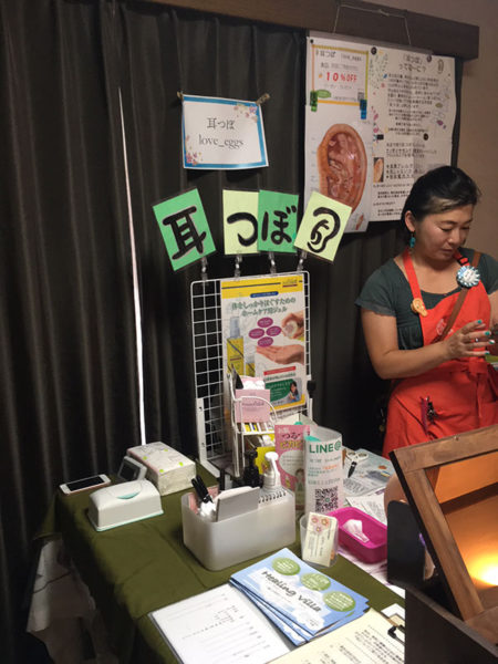 「ちふみんのプチサロン」「耳つぼlove_eggs」「よもぎ蒸しサロンほっか」の3店が出店している。既に施術を受けている人が2人いた。予約票を見るとあらかた埋まっていて、人気の程を伺わせる。赤ちゃんを抱いた2人の女性は「近くでこんなリラックスできる場所ができて嬉しい」「順番を待つ間に1階のワークショップをみます」と楽しそうに話した。