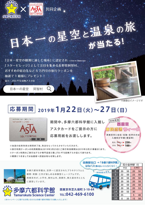 「日本一の星空と温泉の旅」をプレゼントする抽選キャンペーンは田無アスタ専門店街とのコラボ企画で、期間中に入館受付でアスタカードを提示すると、5万円分の旅行券が1組に当たる抽選会に応募できる。旅行先は、星空が美しいと評判の長野県阿智村。