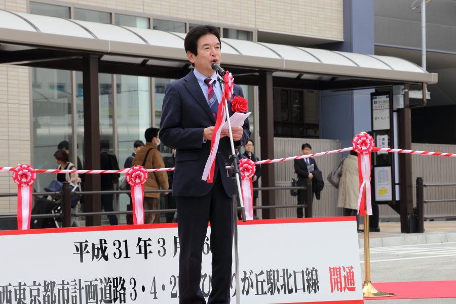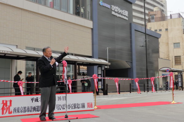 北口線や駅前広場の事業は2008年から始まった。西東京市議会の田中慶明(のりあき)議長は、ひばりヶ丘駅周辺のまちづくりを議会で度々取り上げてきた地元出身。挨拶の中で「長い間要望してきた者として、この日を迎えて感無量です。交通広場と3・4・21号線の完成、交通開放が、地域発展の礎となることを願っています」と述べた。