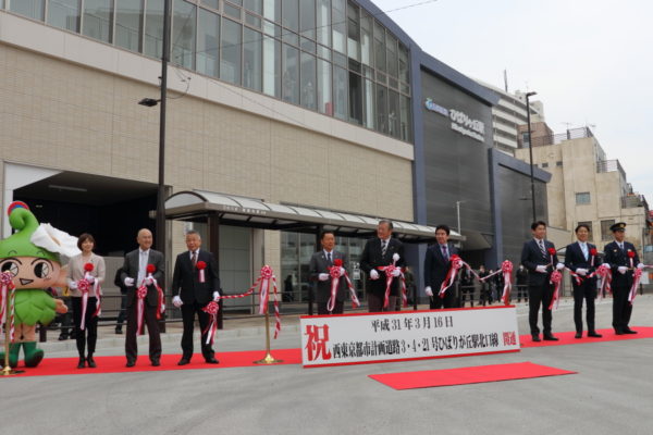 乗り入れに先立って午前11時から来賓ら関係者約30人が集まり、開通式が行われた。西東京市の丸山浩一市長は「北口のエレベーターやエスカレーターなどバリアフリー化は昨年春に終わった。今度の道路と広場の完成は、まちの賑わいだけでなく、まちの防災にもつながる。ひばりヶ丘駅は1日の乗降客が7万2000人余り。ポテンシャルが高く、ますます地域の発展に寄与すると期待している」と述べた。