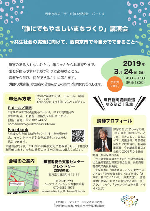 ノーマライゼーション西東京の会(通称ノマ西東京)は3月24日、毎日新聞社論説委員(社会保障担当)の野澤和弘さんを講師に招き、「西東京の“今”を知る勉強会」を障害者総合支援センターフレンドリーで開催した。ノマ西東京は、住み慣れたまちで、安心・安全な暮らしを次世代に継ぐことをミッションとし、農業と福祉の連携を模索しながらまちづくりのために活動している。