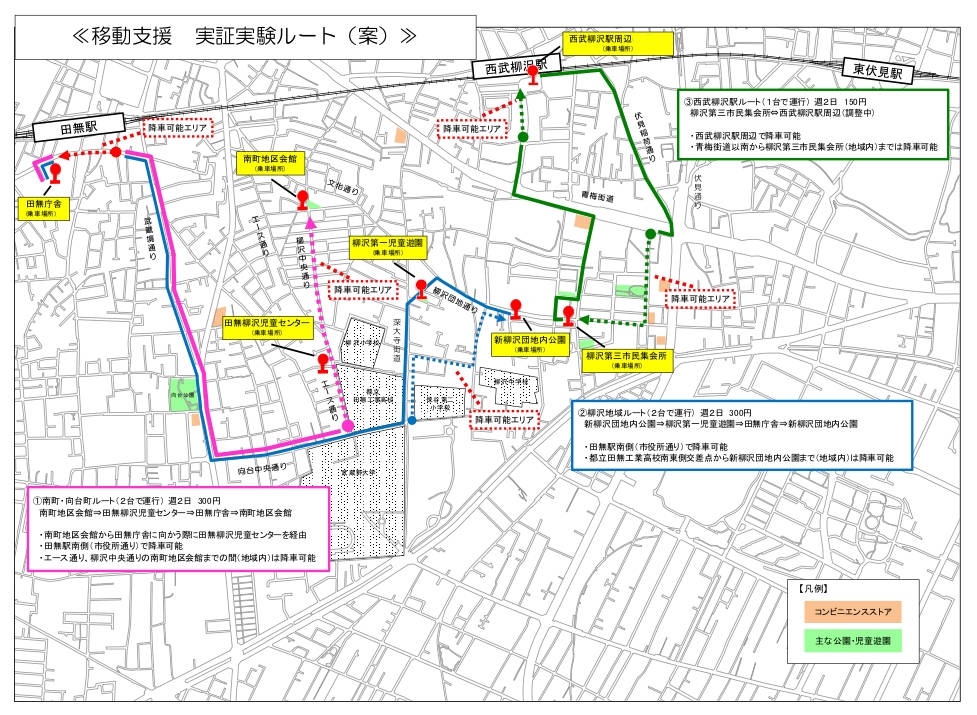 実証実験が始まるのは、西東京市の西武新宿線から南側の向台町1丁目、南町2丁目、柳沢2丁目などの地域。走行ルートは3本あり、柳沢第3市民集会所から西武柳沢駅南口のルートのほか、柳沢地域からと、南町・向台町から田無駅へ向かう2本のルートも用意される。各ルートとも週2日運行。午前10時から正午、午後2時から4時までの利用出来る。