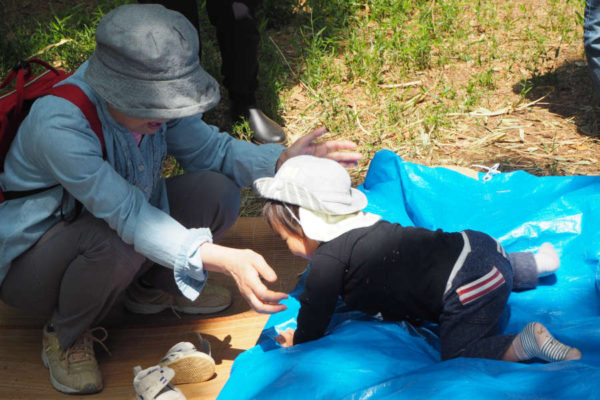 里山体験では、子ども対象の木登り、自然木の工作、公園で刈り取った草を詰めたハイジベッドもある。2歳ぐらいの子どもが、飛び跳ねて転ぶ。それがおもしろいのか何度も繰り返す。ゆったりと寝転ぶ大人もいる。伸びた葉先の向こうに空が広がる。「寝ると気持ちいいね」と声が出る。