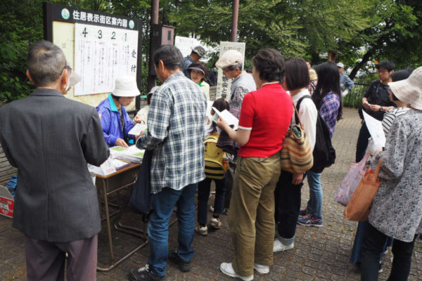午前9時15分の受付開始前から、人が集まり始めた。受付で公園案内図と一緒に焼きそば券(250食予定・無料)も配布された。自然観察会は順次20人程度が、ガイド付きで園内を一周する。樹林と共生している蘭がある。クヌギや草地、花の群生もある。2ヘクタールの公園だが、種類も多彩だ。 表示版には会が制作した小冊子「武蔵野の雑木林再生」の該当ページが表示されていて、わかりやすい。「気持ちいい。ピクニックみたい」と言う子どもたちに、「これがクヌギだよ」とお父さんが話す。次のグループが、もう来た。「ごめんなさい。もうすこしスピードを上げてください」と」スタッフからガイドに声がかかる。
