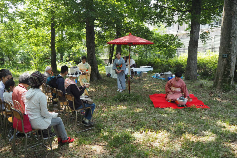 大人向けには、酵素づくりや押し花づくり、草木染展示などがある。市の茶道華道文化協会による本格的な野立てもあり、着物姿の女性たちが参加者にお茶をふるまう。子どもたちも真剣な顔つきで、茶碗をまわし、お茶を味わっていた。