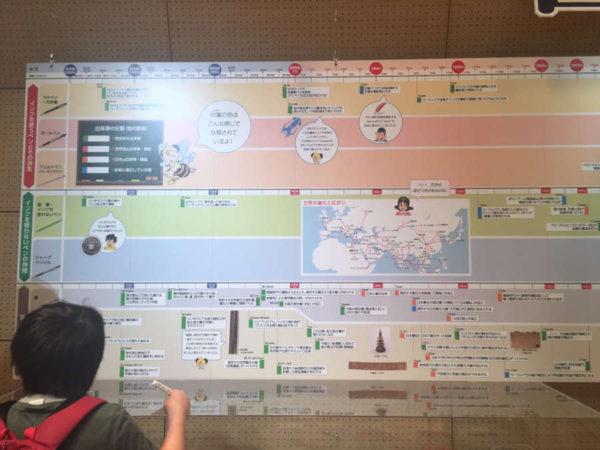 紀元前5000年から現代までの「歴史的な出来事」「世界初の出来事・商品」「日本初の出来事・商品」「会場に展示しているもの」が年表に書き表されていた。
