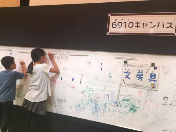 会場の奥のは「文房具スタジアム」のスペース。幅6910mm(!)の模造紙が貼られ、「6910(ロクト)キャンパス」と名付けられていた。テーマは「好きな文房具をかこう」とあったが、子どもたちは目を輝かせて自由に絵を描いていた。大きな落書き帳に向かって、好きなだけ線を伸ばし、紙をはみ出し、果ては寝転んで描いている子どももいた。「書くところが少なくなると新しい紙をセットします。今日はまだ2枚目です」とスタッフが説明した。