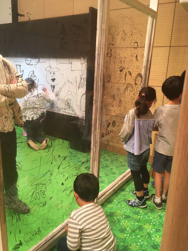もう一つ、ガラスの壁も格好の落書き帳であった。透ける壁の向こう側に立っているお父さんの顔に髭を付け足して写真に撮ったり、子どもの人型をなぞったり。ここでも思いっ切り描く楽しさを満喫している様子が見て取れた。