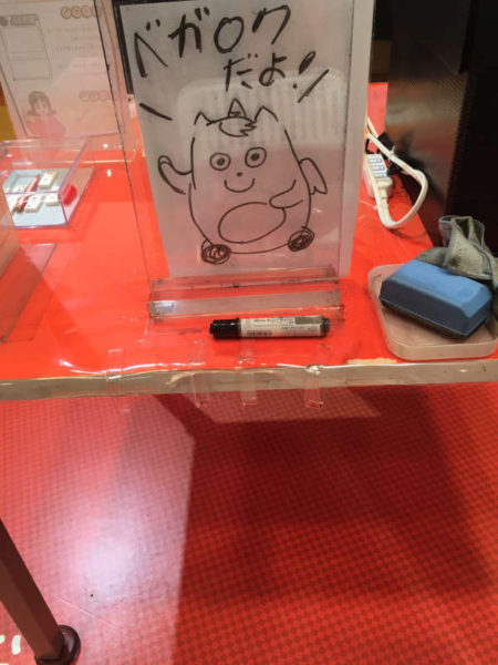 多摩六都科学館のキャラクター「ベガロク」をささっとフェルトペンで描いている人がいた。この「ぶんぶん文具展」のチラシをデザインした中村晋也さんだった。「ようやく最終日になって来ることができました」と話した。ご家族で楽しそうにガラスの壁にいたずら書きをしている。プロの原点はこんな遊びにあるのかもしれない。今日、思いっきりペンや紙で遊んでいる子どもたちの中にも未来のデザイナーがいるかもしれない、と思った。