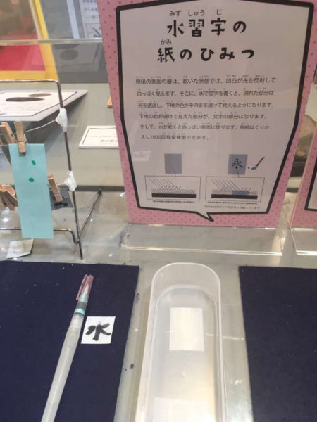 「水習字に挑戦!」のコーナーでは、水を含ませた筆で文字を書いた。墨で書いたような黒い文字が、数分置いておくと消えていく。不思議!「この紙、また使えるね」と可愛い声が聞こえた。