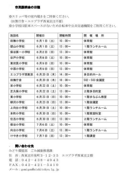 資源物戸別収集市民説明会は6月1日から9日まで計6回開かれ、計400人の住民が参加した。1会場の参加者は平均67人-。西東京市議会第2回定例会の一般質問初日の10日、みどり環境部長の萱野洋部長が中村駿氏(共産)の質問に答えた。8日の谷戸小学校会場は113人で、平均のほぼ2倍の参加者だった。
