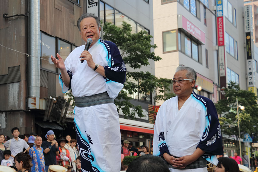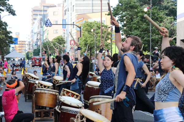 午後3時30分過ぎ、フェスティバルの名誉実行委員長を務める西東京市の丸山浩一市長が浴衣姿で登場。「今年最後のサマーフェスティバルを思い切り楽しみましょう」と挨拶。そのあと地元の和太鼓グループ「TAWOO」(タオ)の息の合った演奏で路上パフォーマンスが始まった。