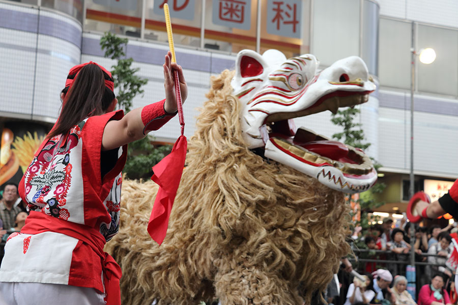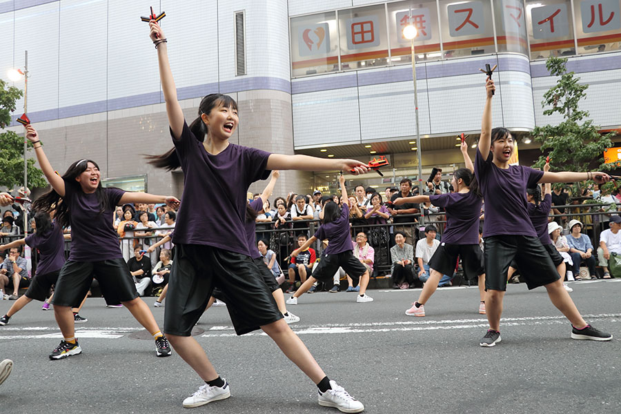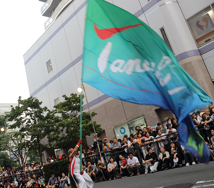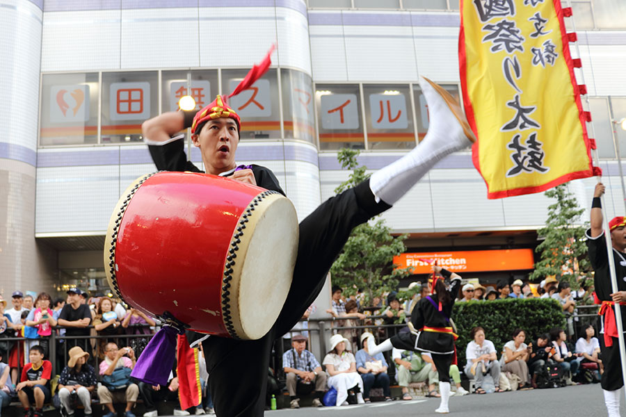 子どもたちが集まる3団体のダンスが終わると、朝霞なるこ遊和会らの踊りがあり、続いて「フェスティバルに育てられた」という地元の「TANASHIソーラン会」が大旗を掲げて登場。田無高校ダンス部との共演を交えながら、約100mの路上ステージいっぱいに踊って、沿道に詰めかけた人たちの大きな拍手を浴びた。沖縄の演舞団体「昇龍祭太鼓」のパフォーマンスにも歓声が上がった。