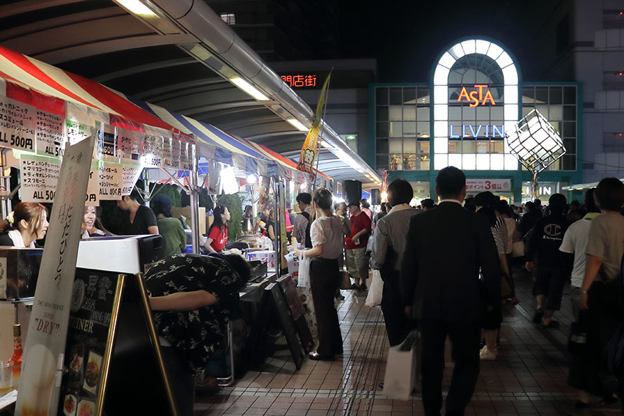 この日は快晴。日差しの強い午前11時にペデストリアンデッキで模擬店が店開き。ミニステージで子どもたちのダンスチームなどが見事に踊った。夜8時過ぎまで大勢の人たちで賑わった。