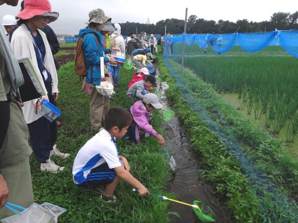 次は水田で、水生生物の生態を観察する。子どもたちは網で溝にいる蛙やゲンゴロウを探す。「あっちの方がいるみたいよ」「後ろからそっとすくわないと捕れないよ」「落ちるなよ」…。保護者も心配そうだ。「これはトンボのヤゴだね」「それは日本アマガエル」とスタッフの大森拓郎さんが丁寧に説明した。