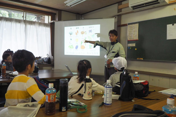 「植物は実を動物に食べてもらい、遠くに種を運んでもらい繁殖していく。運んでほしい動物に合わせて果実の特徴が少しづつ違います。鳥は甘くなくても実を啄んでいきますが、タヌキや猿などに食べてもらうために木から落ちた果物を追熟させるエチレンが出る。それで甘くなる。生き物のつながりで果実の性質が生まれるんです。桃やリンゴなどは熟すると落ちます」「先生、桃太郎の桃は水に浮いています」と子どもたち。どんどん意見や質問が出て、丁寧な答えが「わかりやすかった」と好評だった。