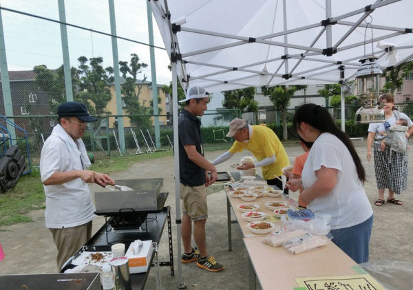 焼きそばは、仕込みが大変。キャベツを切ったり、もやしや肉、そばを等分に分けたりして、すぐに焼き始められるようにしておく。会場に行ってからは炭も起こす。「おやじの会」などで慣れているお父さんが毎回奮闘。今回は、オーストラリアから夏の間おばあちゃんの家に遊びに来ていた高校生も紅しょうがをのせるなどして手伝ってくれた。