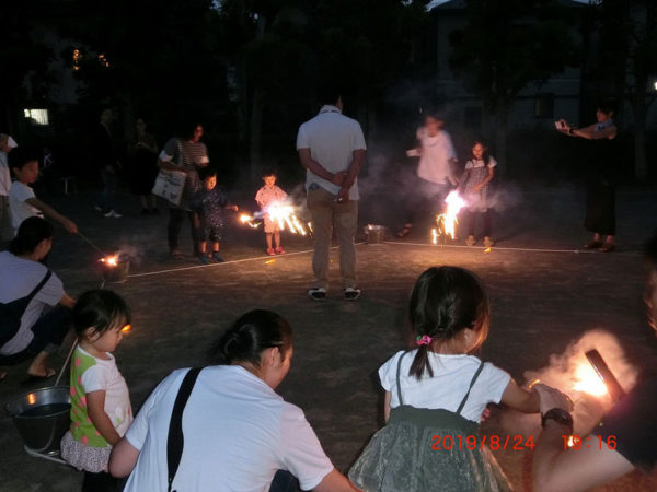 そろそろ夏も終わりのこの頃、午後7時前には真っ暗になる。これからいよいよ花火の時間。花火といっても、打ち上げ花火ではなく、各自が手持ちでやる花火。この頃は、マンション住まいなど、家で花火をやることがないのか、皆おっかなびっくり。花火が終わると会場は、真っ暗に。夏が終わってしまった寂しさとも重なる。