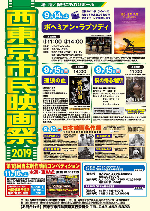 魅力的な映画を地元で上映して20年。「西東京市民映画祭」が今年も9月14日から3日間、保谷こもれびホールで開かれる。初日のメーン作品は大ヒットした映画「ボヘミアン・ラプソディ」。そのほか話題の日本映画、記憶に残る名作を連日上映。11月にはショート映画の応募作品を表彰する「自主制作映画コンペティション」も控えている。全国の映画ファン、関係者も注目する恒例のイベントだ。