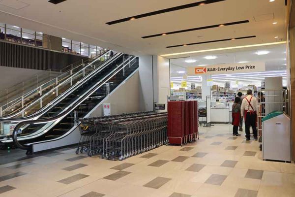 1階の入口を入ると、スーパー「オーケー」が目の前。カートが並び、買い物かごが山積みになっていた。