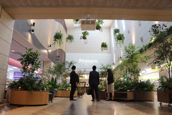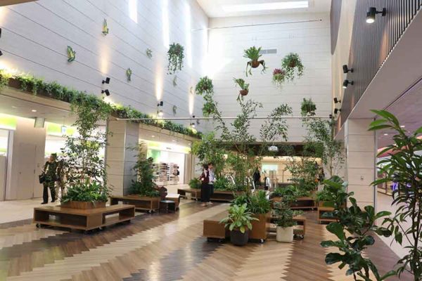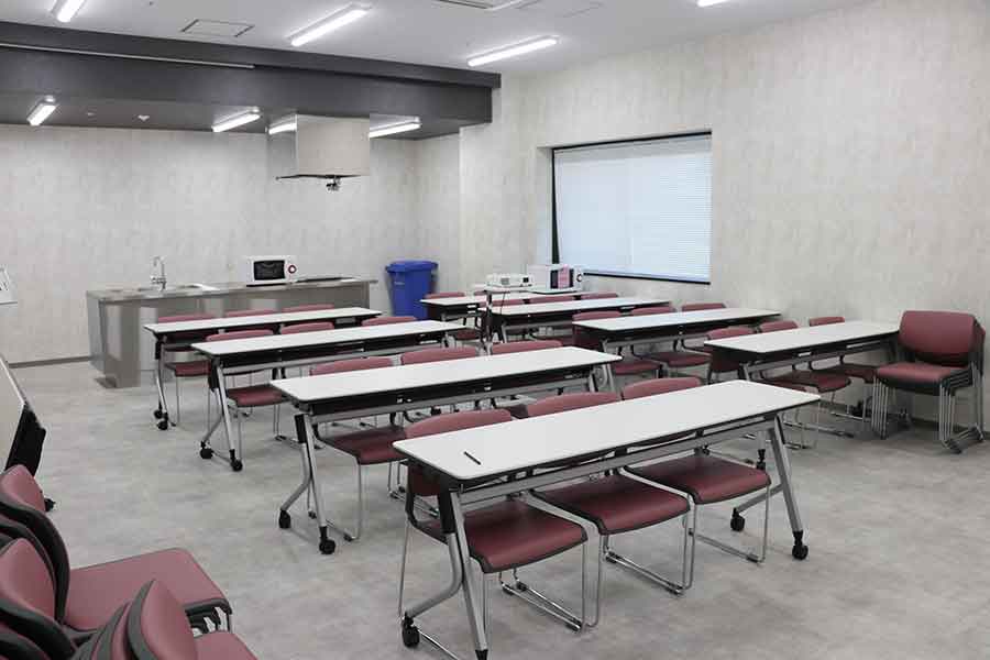 エスカレーターを上がると、イベントスペースが広がる。吹き抜けの天井は高く、観葉植物など室内の植栽は移動可能。大型の展示用パネル30枚が用意され、多くのイベントを受け入れることができる。その奥に調理台付きの会議室もあり、低料金で貸出を予定しているという。