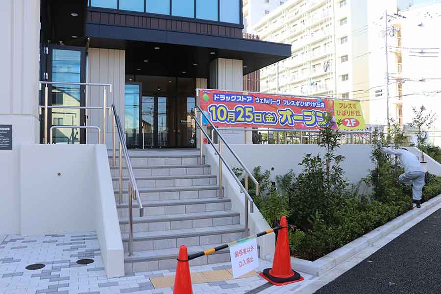 西東京市谷戸町に出来たショッピングセンター「フレスポひばりが丘」の内覧会が10月23日に開かれた。25日の開店を控え、施設内の多くの店は商品の陳列など準備に忙しい。2階のイベントスペースは3階まで吹き抜けで広々していた。しかし道路からの入口3ヵ所は階段。バリアフリーの課題が目に付いた。