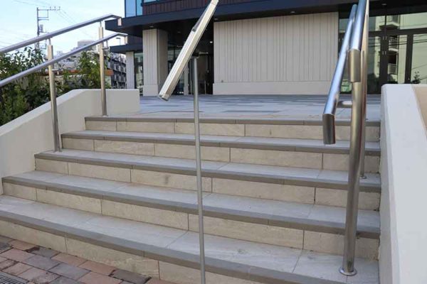敷地は東北の角にあり、施設に入るには三方の階段を通ることになる。道路から敷地まで、身の丈ほどの高さを5段から9段の階段を上がらなければならない。買い物カートもベビーカーも車いすも、登り切るには文字通りハードルが高い。北側に設置されて駐輪場に通じる入口も、遠回りしないと通れない。バリアフリーの世の中なのに、特段の事情があったのだろうか。