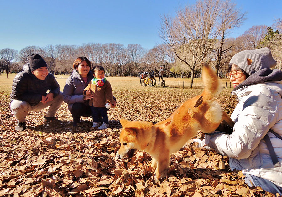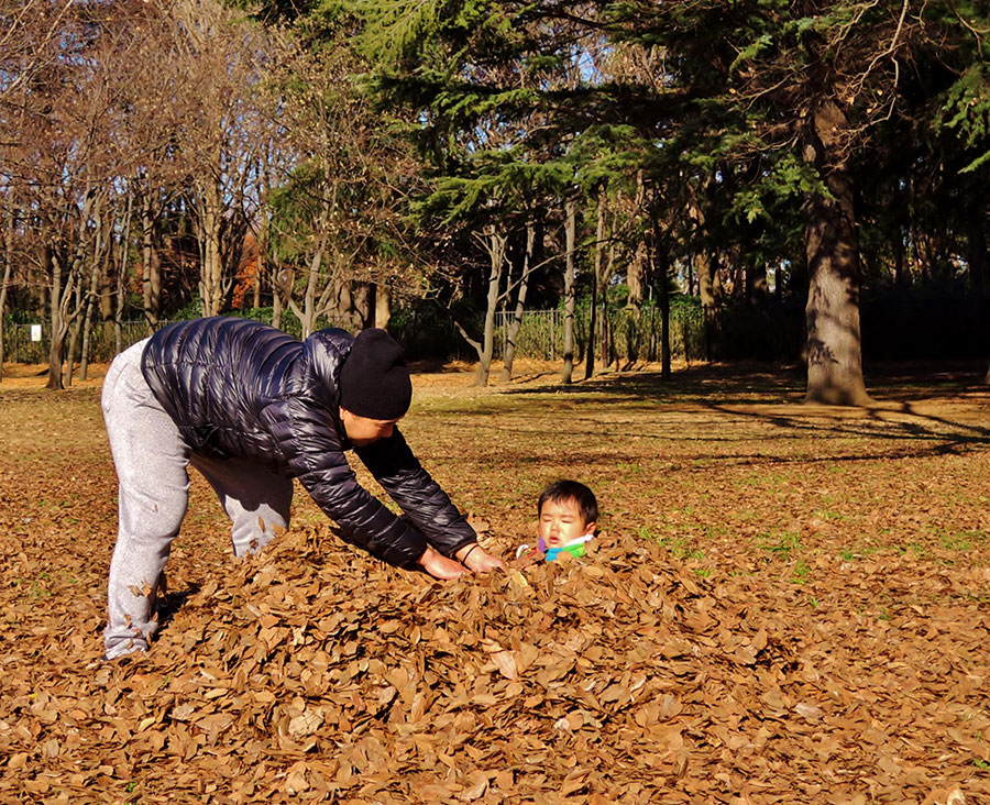 都立小金井公園の「いこいの広場」。落ち葉の山をベッドにしちゃえ。近くに住む山崎さんと智仁くん父子。寝心地はどうかな(上)。落ち葉の絨毯に、子犬も大はしゃぎ。笑顔で見守る山崎さん家族(下)。(2020年1月1日午前11時、片岡義博)