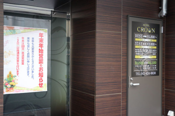 広場から離れると「営業は1月4日から」「6日から営業」の張り紙が多い。こぢんまりした構えの店はほとんど「お正月休み」。レストラン、食堂、酒場…。働き方改革の風が吹いたのか。「お知らせ」を出したラブホテルのドアも閉じている(下)。営業は2日から。これは関係ないか。