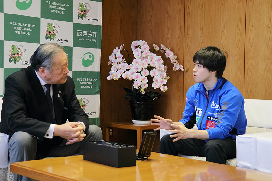 西東京市PR親善大使の卓球選手森薗政崇さん(24)が1月28日午前、田無庁舎を訪れ、全日本卓球選手権大会の混合ダブルスで伊藤美誠選手と組んで優勝し大会3連覇したと報告した。