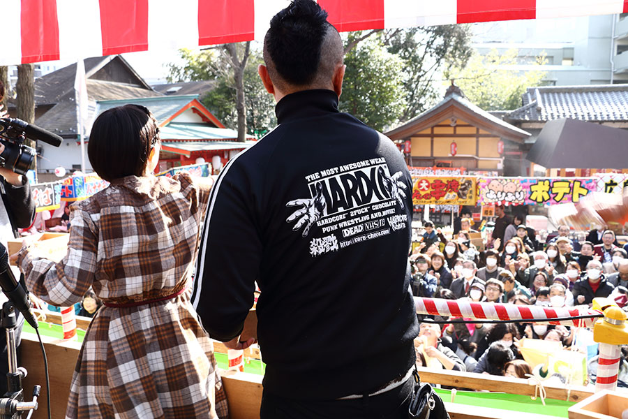 一般の人たちを対象にした豆まきは午後1時30分ごろから夕方まで計5回行われた。最初の回に集まったのは約300人。豆などをキャッチしようと、手に紙やビニールの袋を広げて懸命に動いていた。