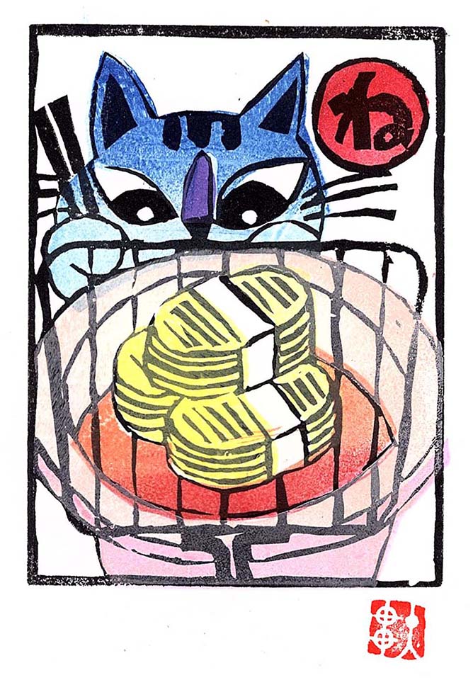 そのきっかけは、装丁家の大貫伸樹さんが趣味でやっている消しゴムハンコ教室をFBで宣伝するのに、「猫に小判」の絵札を使ったことだった。構図もよく、素敵な色あいで、「これでカルタを作ったら良いね」というような何気ない会話が交わされていた。