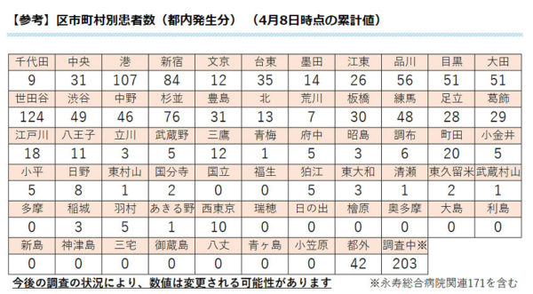 区市町村別は4月8日時点で世田谷区が124人、港区107人、新宿区84人、杉並区76人など。多摩地域では町田市20人、三鷹市12人、八王子市11人など。西東京市は前日より1人増え、再び10人に戻った。