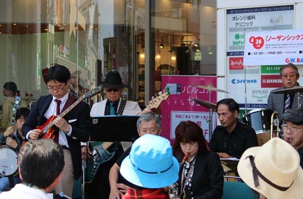 イス席はあっという間に埋まった。年輩の夫婦や家族連れ、若い男女もバンドを取り囲んだ。演奏が始まると身体を揺らし、手拍子をとる。乳母車を押すお母さん、子どもを肩車に乗せるお父さんもいる。スマートフォンのカメラで撮影する姿も見られた。