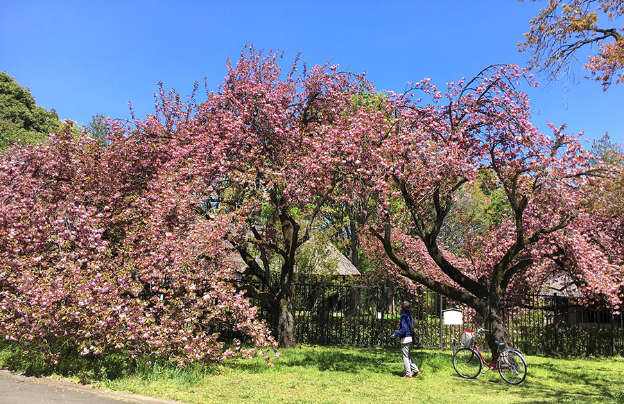 ソメイヨシノが散った都立小金井公園の「桜の園」では、ヤエザクラの関山(カンザン、あるいはセキヤマ)が大輪の花を咲かせている。