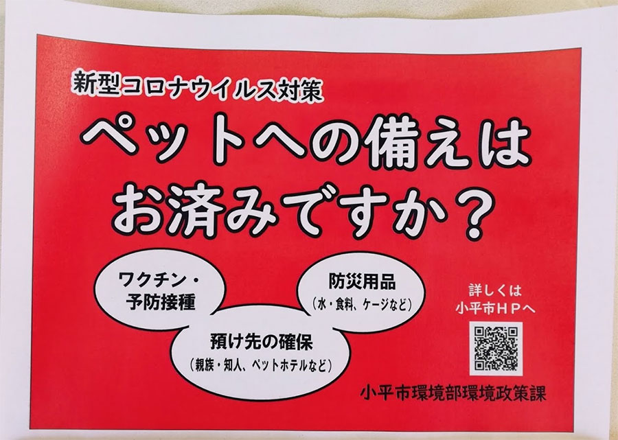 今回、新型コロナウイルス対策として作成した赤色のポスター(A5サイズ)は「ペットへの備えはお済みですか?」と呼びかけ、「ワクチン・予防接種」「防災用品(水・食料・ケージなど)」「預け先の確保(家族・知人、ペットホテルなど)」と記している。さらに小平市のサイトには「ペットを預ける場合には感染者から飛散したウイルスがペットの体に付着している場合があるため、シャンプーなどで体の表面を清潔にしましょう」と注意を喚起している。