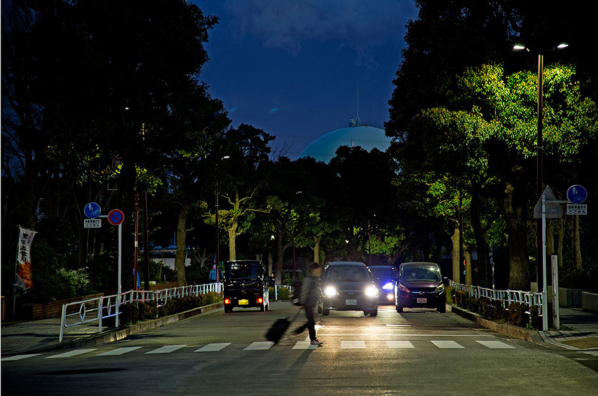 望遠レンズの良いところは何と言っても圧縮効果! 前後の距離感をグッと縮めることで、自然な回廊ができる。しかし、良いタイミングが来なくてレンズを覗き続けること10分。自転車を押す人とこちらに向かってくる人が、良い良い! おまけに対向車のライトが上手く差し光になっていてストーリーを作ってくれた。