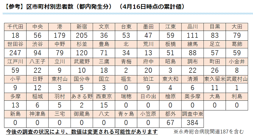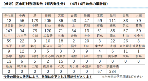 区市町村別では16日の時点で世田谷区247人(前日比+4人)、新宿区205人(+18人)、港区179人(+7人)、杉並区120人(+5人)、品川区111人(+7人)など。多摩地域では町田市26人(+1人)、八王子市22人(+1人)、調布市22人(+2人)、府中市20人(0)三鷹市18人(+2人)、西東京市は2人増で15人になった。