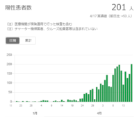東京都は4月17日、新型コロナウイルス感染の新たな患者は同日午後6時30分時点で201人になったと発表した。感染経路不明で調査中は134人、患者総数は2794人になった。1日の患者が200人を超えたのは初めて。西東京市は2人増で15人とこれまでの最多を記録した。