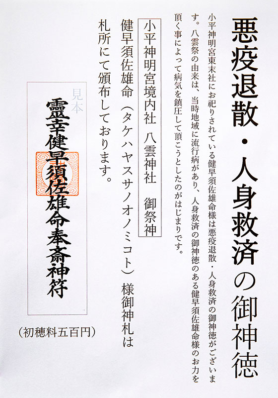 多くの人出で賑わう八雲祭は春の伝統行事として地元に根づいてきたが、感染拡大を受けて3月末に初の中止を決定した。大祭に代わって今年は神主だけでお祓いをして祝詞をあげる神事を執り行う。600人以上いる氏子らには、札所で参拝客に頒布している「悪疫退散・人身救済」の御札を配布する。