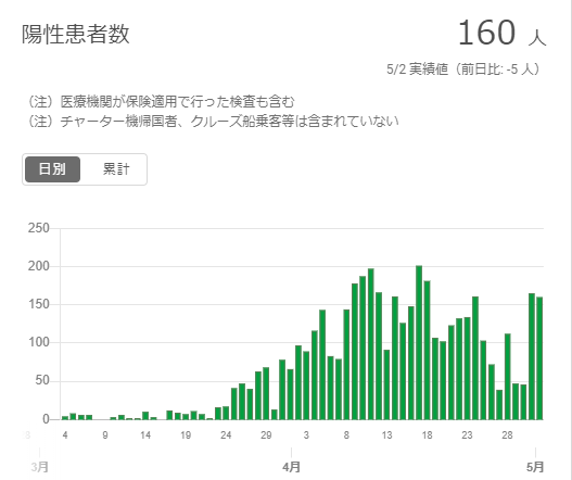 東京都は5月2日、都内の医療機関から報告された新型コロナウイルス感染の新たな患者は160人となり、感染経路不明はこのうち74人などと発表した。新患者は2日連続100人超となった。重症は100人、死亡は15人増の141人、患者総数は4477人となり、西東京市の患者は34人のままだった。