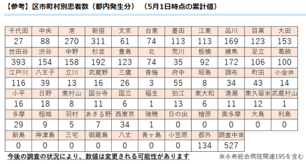 区市町村別の上位5は5月1日の時点で、世田谷区393人(前日比9人増)、新宿区311人(+7)、港区270人(+2)、杉並区192人(+9)、練馬区172人(+4)。多摩は府中市55人(+1)、町田市43人(+2)、八王子市39人(0)、西東京市34人(0)、調布市3432人(+2)となっている。