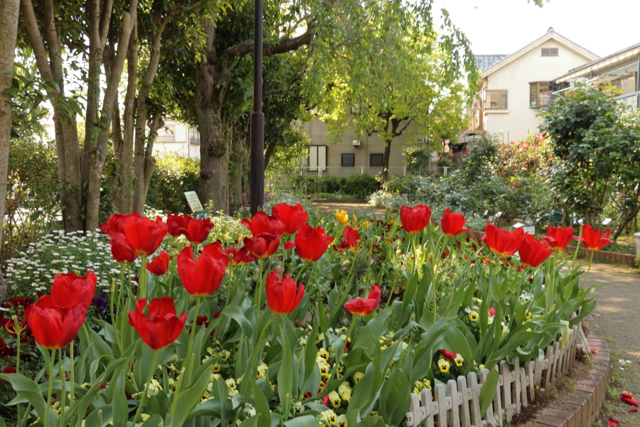 2日から閉鎖のはずなので、ちょっと失礼してバーの脇をすり抜け、園内へ入った。チューリップの赤い花が目立つけれども、ここでもバラの枝先はほぼ切り落とされていた。