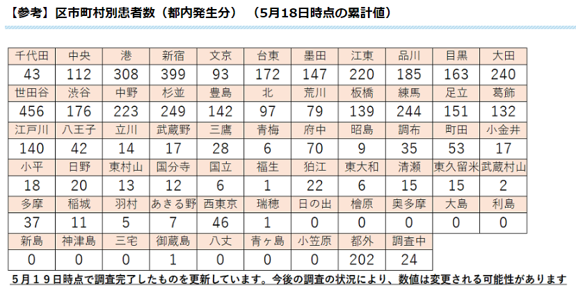 区市町村別の上位5は5月18日の時点で、世田谷区が456人(+1)、新宿区399人(+1)、港区308人(0)、杉並区249人(+1)、練馬区244人(+1)と続いた。