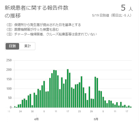 東京都は5月19日、都内の医療機関から報告された新型コロナウイルス感染症の新たな患者は5人となり、感染経路不明は3人などと発表した。死亡は3人増えて244人、患者総数は5070人。西東京市は前日と変わらず46人だった。