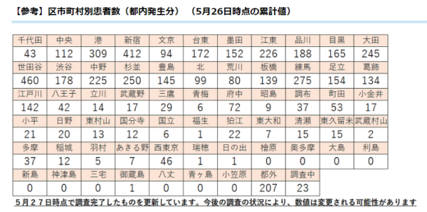 区市町村別の上位は5月26日の時点で、世田谷区460人(+1)、新宿区412人(0)、港区309人(0)、練馬区275人(0)、杉並区250人(0)となった。